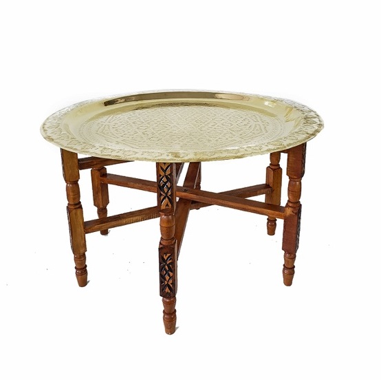 Table basse marocaine, piètement bois, plateau doré D 80cm د.م.100.00
